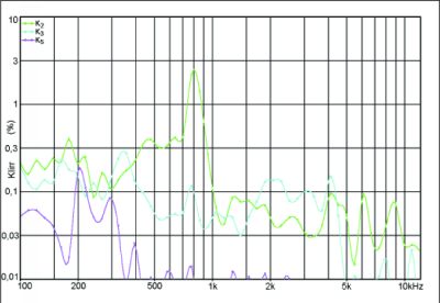 Hohe Klirrspitze bei 800 Hertz, sonst sehr niedrige Verzerrungen.