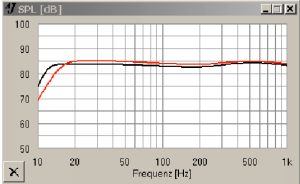 Zum Tieftöner Audiotechnology 15 2E 102 10 20 K ist die Tiefton-Simulation nachzuliefern. Die beiden Kurven zeigen die simulierten Frequenzgänge der empfohlenen Bassreflexgehäuse bei 0,2 Ohm (schwarz) und 1,0 Ohm (rot) Vorwiderstand.
