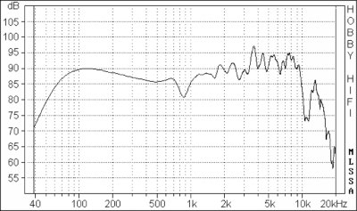 Fünf Dezibel zu viel schrieb das Diagramm des Schalldruck-Frequenzgangs dem Breitbandlautsprecher 12SP100Full von Speaker HiFi gut. Korrekt sieht das Diagramm so aus: