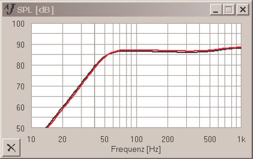 Monacor SP-20E: Tiefton-Simulation mit Vorwiderstand 0,2 Ohm (rot) und 0,5 Ohm (schwarz)