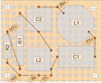 Seite 47: Der Lageplan für die Zweiweg-Frequenzweiche des Bauvorschlags “Dschinn” wies eine