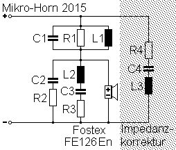 Im Artikel über den Bauvorschlag „Mikro-Horn 2015“ fehlt das Schaltbild zur Frequenzweiche. Hier ist es: