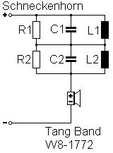 Seite 40: Im Artikel über den Bauvorschlag „Die Schnecke“ fehlt das Schaltbild zur Frequenzweiche. Hier ist es: