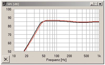 Saubere Bassreflexabstimmung, nur minimales Tieftonplateau, niedrige Grenzfrequenz um 40 Hz trotz relativ hoher Resonanzfrequenz von 50 Hz